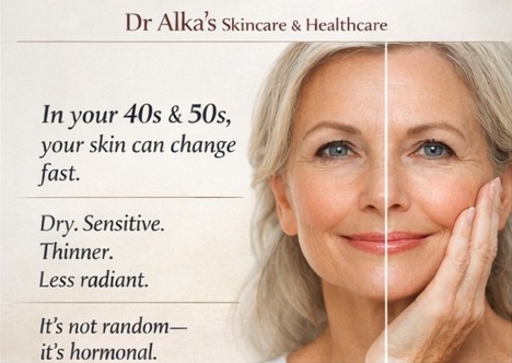By Dr Alka Mehta Dermatology & Skincare Many women in their 40s and 50s notice sudden, unexpected shifts in their skin.Skin that once felt balanced may now seem: Dry Sensitive Thinner Less radiantThis isn’t random — it’s hormonal. What Happens to Your Skin During Menopause?The primary driver is the decline in estrogen. This single hormonal shift influences severalkey skin functions:Collagen ProductionEstrogen stimulates collagen.When levels fall, skin loses firmness, bounce